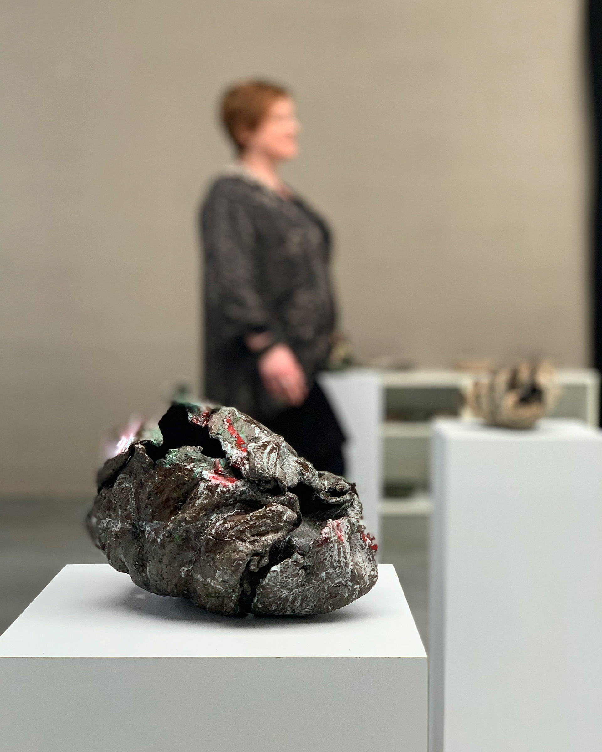 Ik geef ze een tweede leven in klei. Soms druk ik ze af, duw hun textuur in het oppervlak met glazuren. Wat overblijft in de keramische sculpturen is een nieuwe organische vorm met een herinnering aan het blad.